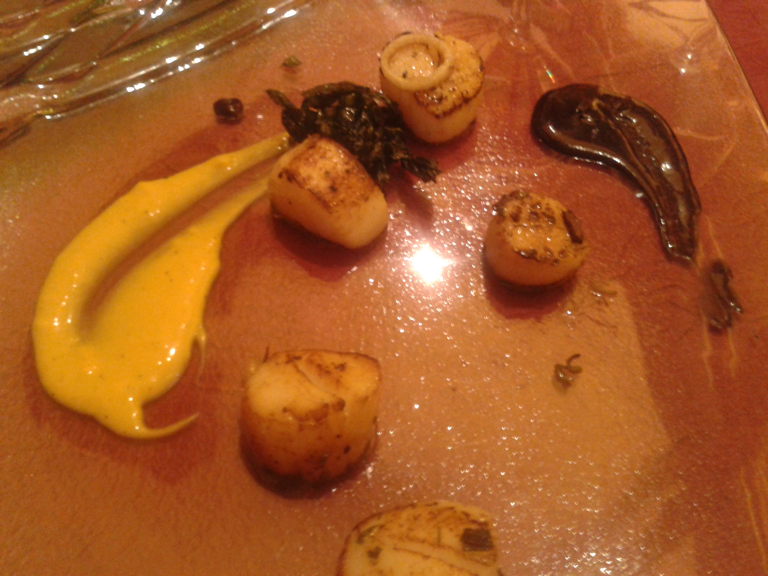 Une « infusion » de céleri avec foie gras poché (une tuerie !), Saint-Jacques poêlées et encre de seiche (divin !!)