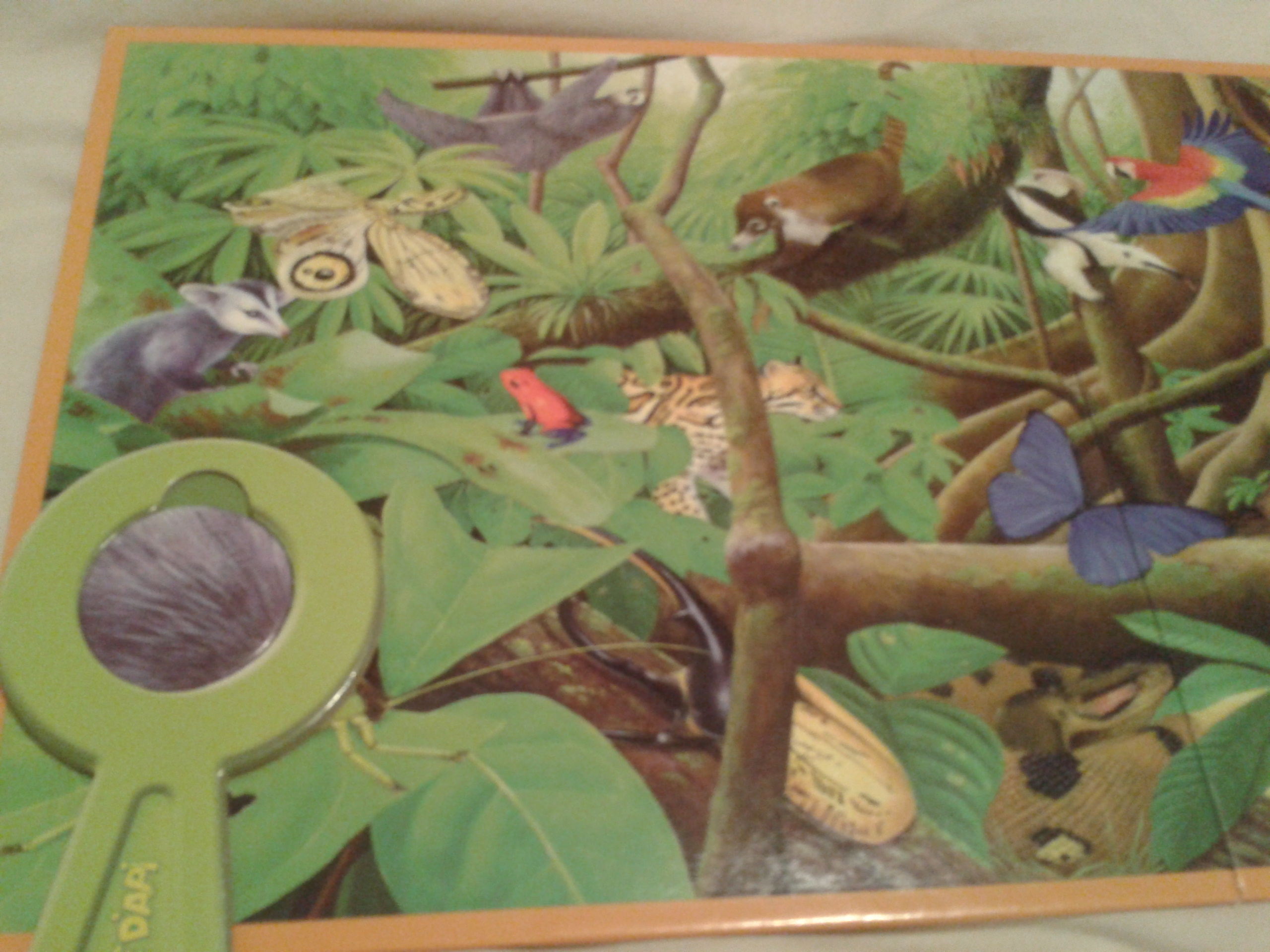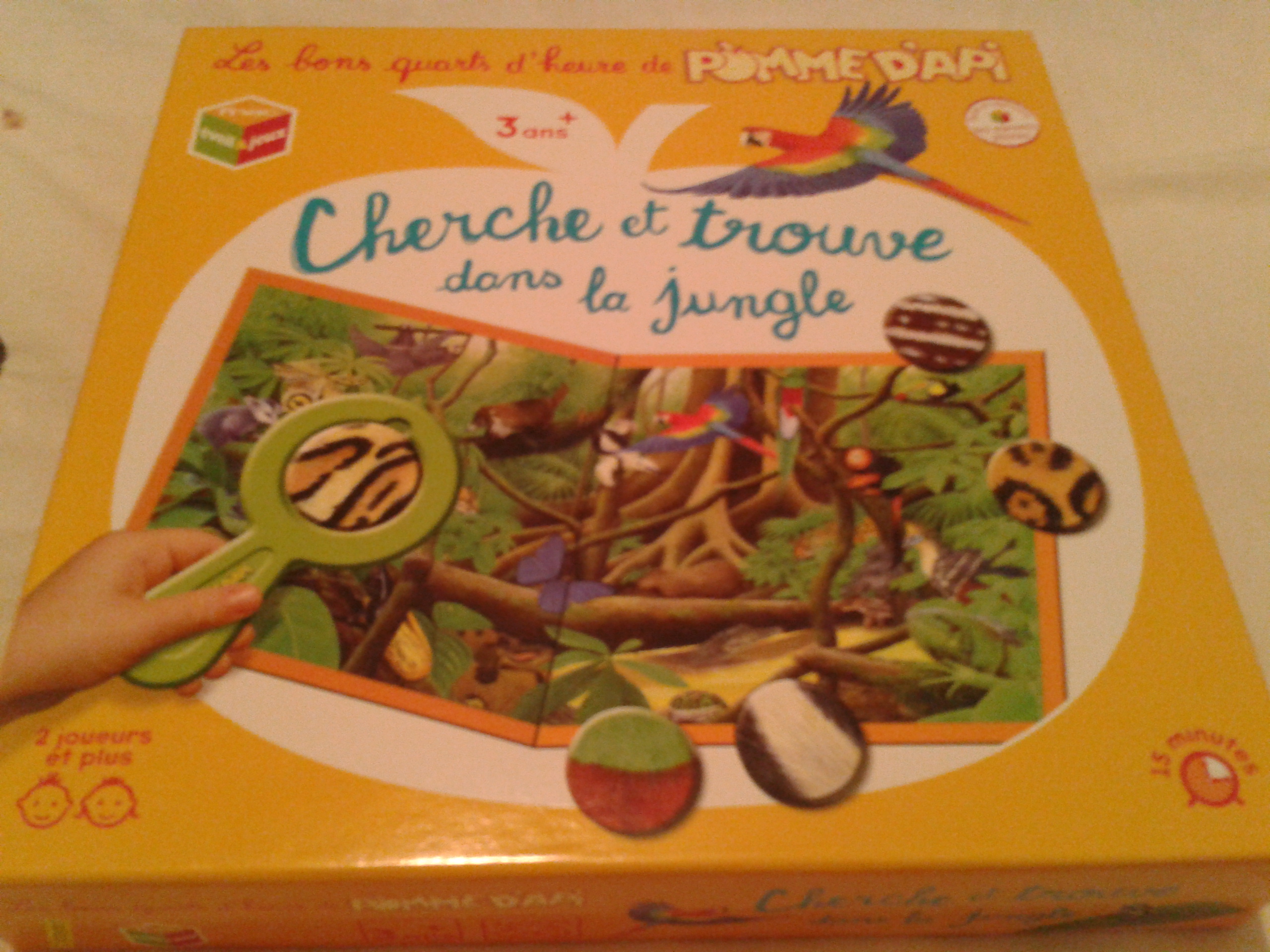 La règle du jeu « Cherche et trouve dans la jungle », à partir de trois ans : on pioche un pion qui représente le détail d’un animal (plumes, pelage..) et l’enfant doit retrouver cet animal grâce à une (fausse) loupe dans laquelle il a glissé le pion. Le premier qui trouve doit attraper la loupe. FlashMcQueen n’a que trois ans et quelques mois, et a parfaitement compris le jeu et s’est vraiment bien amusé, il a retrouvé facilement les animaux et a appris quelques nouveaux noms d’animaux.