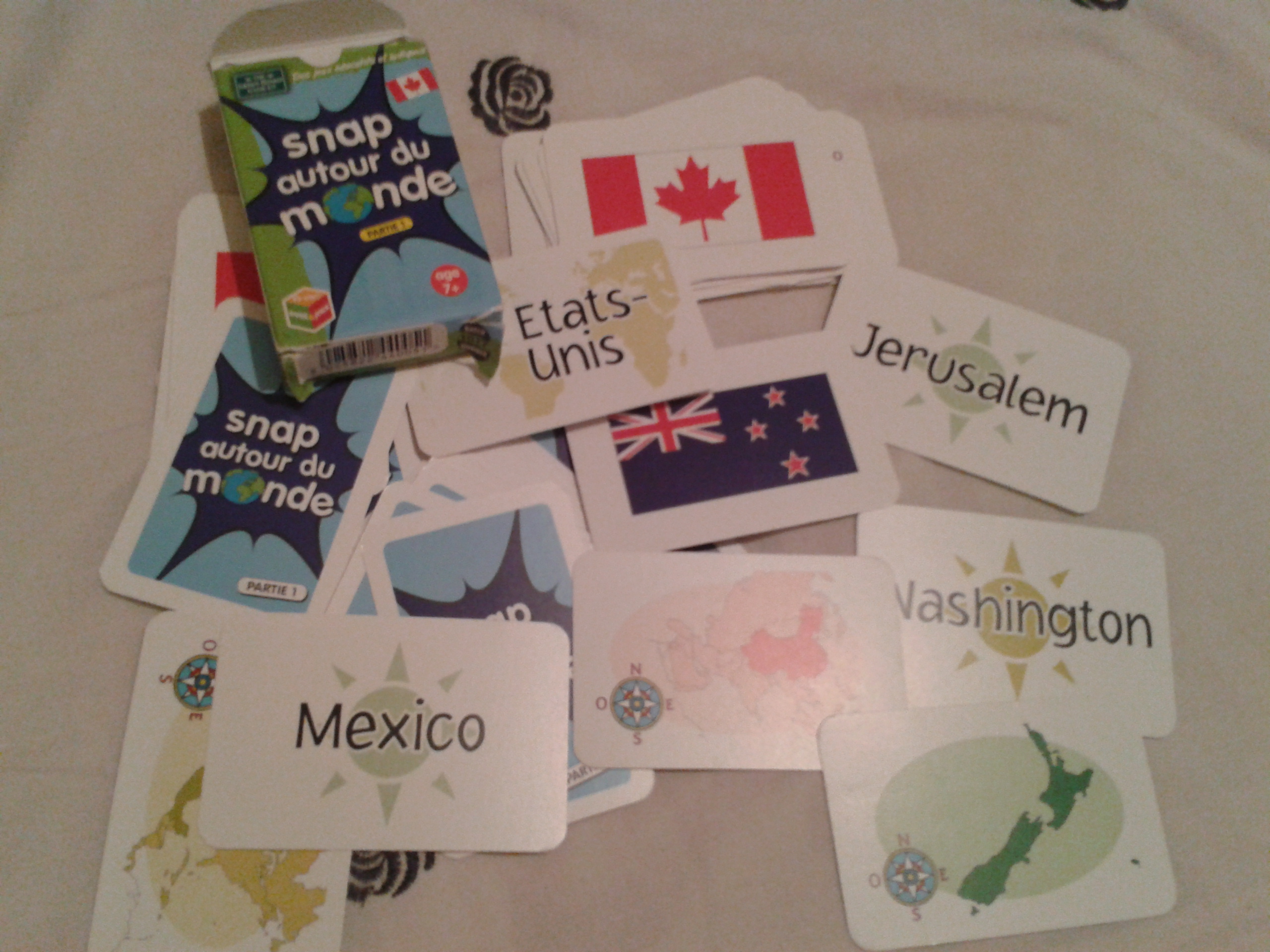 « Snap autour du Monde », à partir de 7 ans, un jeu de cartes qui se joue de deux façons : snap ou mémory. HelloKitty et son cousin ont joué au mémory, c’était super ; ils ont travaillé la mémoire et leurs méninges pour assembler les cartes. Ce jeu regroupe les noms de 13 pays, leur drapeau et leur capitale. Un excellent travail de culture générale et de géographie. On aime beaucoup ce jeu.