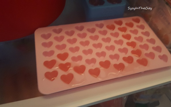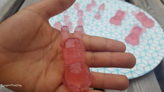 Une fois les petits sachets ouverts, je les ai préparés les doses nécessaires, en leur indiquant la recette, et quelques secondes au micro-ondes. Il suffisait de verser la préparation dans les moules, et attendre entre 60 et 90 mn conseillées au réfrigérateur, une heure a été nécessaire pour les déguster.