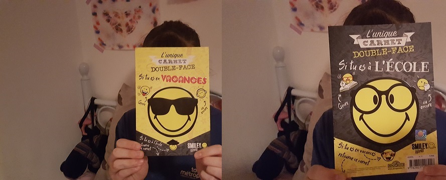 – Smiley l’unique carnet double-face école/vacances. Un chouette carnet que mon ado adore, une façon de s’exprimer en toute liberté avec Smiley ! Un côté à utiliser pendant les vacances, un autre pendant l’école. 150 pages à remplir selon son humeur, du dessin, des bons à découper pour l’école si on est en retard comme « désolé il y avait une licorne devant ma porte d’entrée ». C’est super mignon, un petit cadeau sympa à faire, sorti le 24 mai, prix 9.95 €