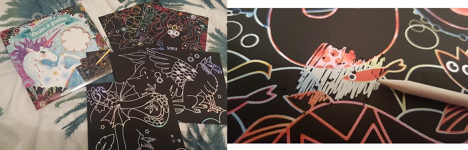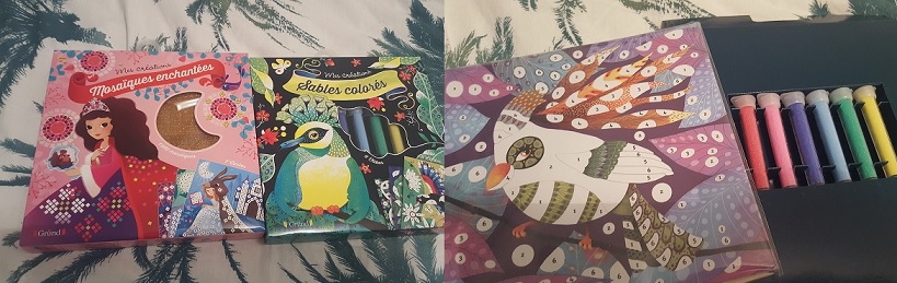 Je suis fan également de leurs pochettes d’activités manuelles, on a eu les mosaïques enchantées, les sables colorés, des cartes à gratter brillantes.