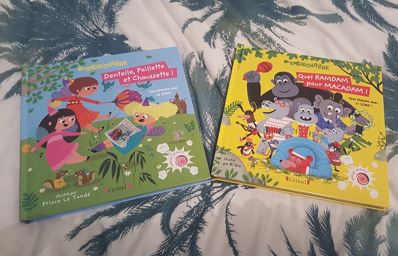 et « Dentelle, paillette et chaussette » : formules magiques rigolotes, ronflements, hurlements de loup, toux de dragon, et même un peu de fée. Un joli livre de 12 sons, ces livres sont sortis en mai, au prix de 12.95 €, je les ai offert à ma petite nièce qui les adore.