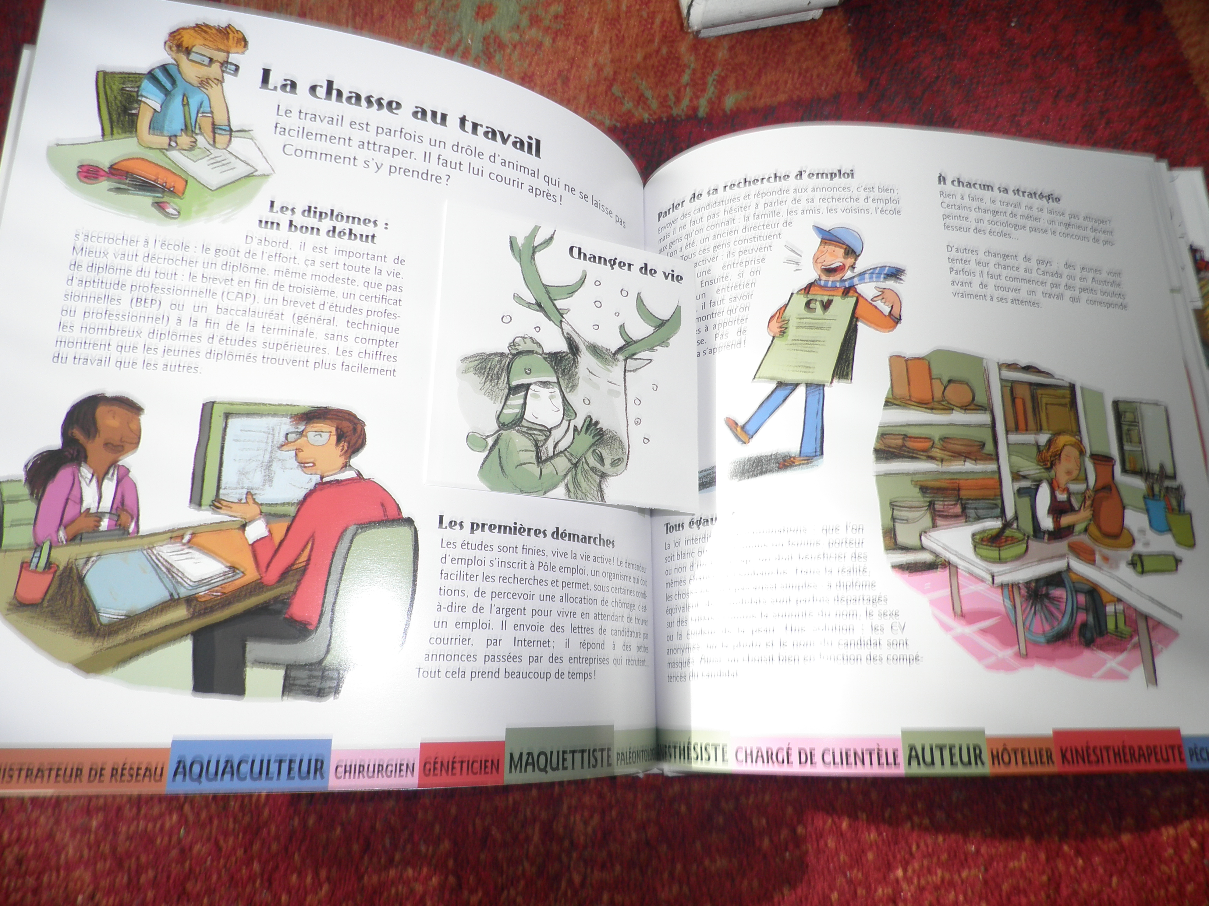 Beaucoup de choses y sont expliquées, le travail c’est quoi ?, le travail d’hier à aujourd’hui, le travail est utile à tous, peut-on vivre sans travail, être au chômage, débuter dans la vie active, les droits des travailleurs, que veux-tu faire plus tard ? et encore bien d’autres… En bas des pages court une frise géante de noms de métiers pour donner plein d’idées, et des dépliants présentent des thèmes et des témoignages pour aller plus loin.