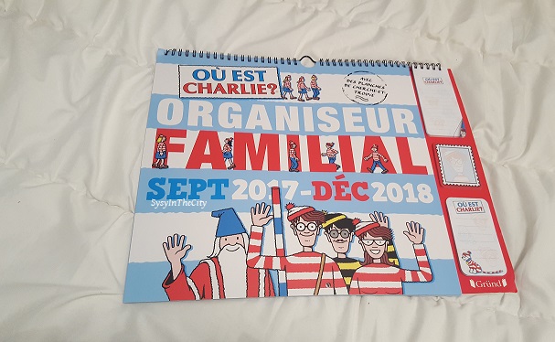 Chaque année, j’utilise un organiseur familial, que j’accroche au mur, et que chaque membre de la famille peut noter ses rendez-vous, nos sorties en prévision, les compétitions de MonChéri… J’aime les grosses cases, la bonne visibilité du calendrier. Cette fois-ci on va tester celui de « Où est Charlie ? » ça devrait plaire aux enfants