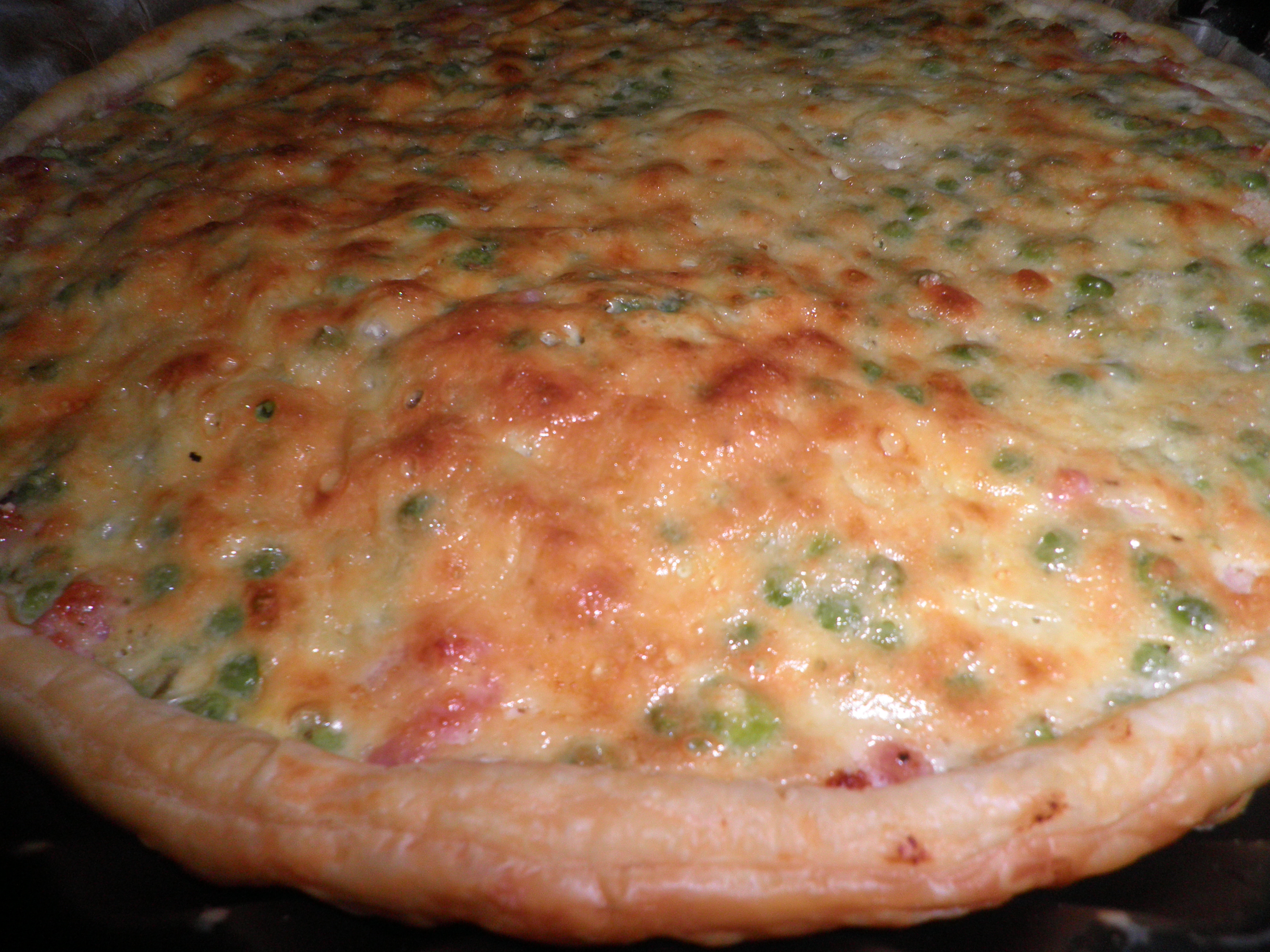 un soir, lassée de cette quiche j’y ai rajouté … quoi ? eh bien des p’tits pois !!! eh oui ma brave dame !!! et alors, tous se sont régalés, « ah maman c’est bien meilleur comme ça, ça fait un p’tit goût sucré ! » oh merci mes enfants, vous êtes trop mignons !