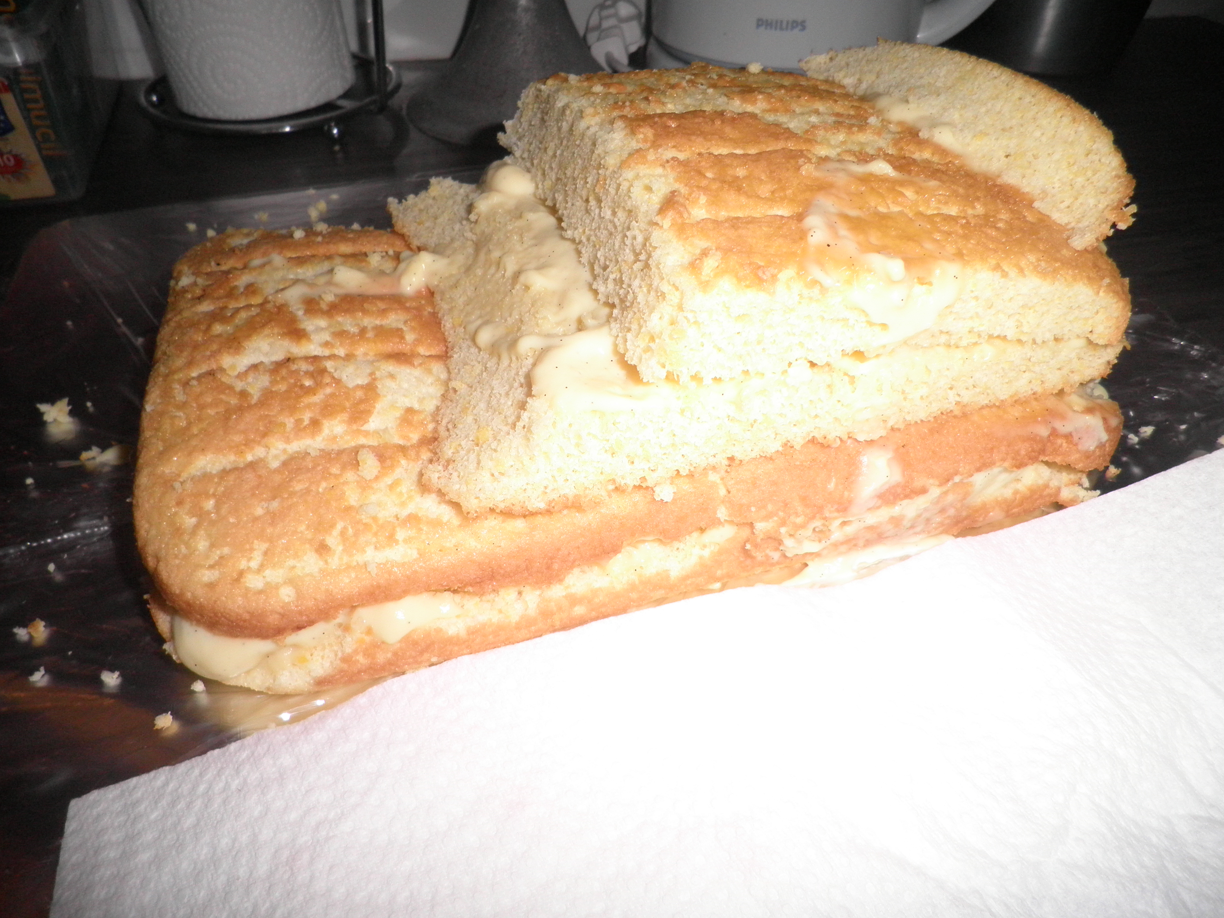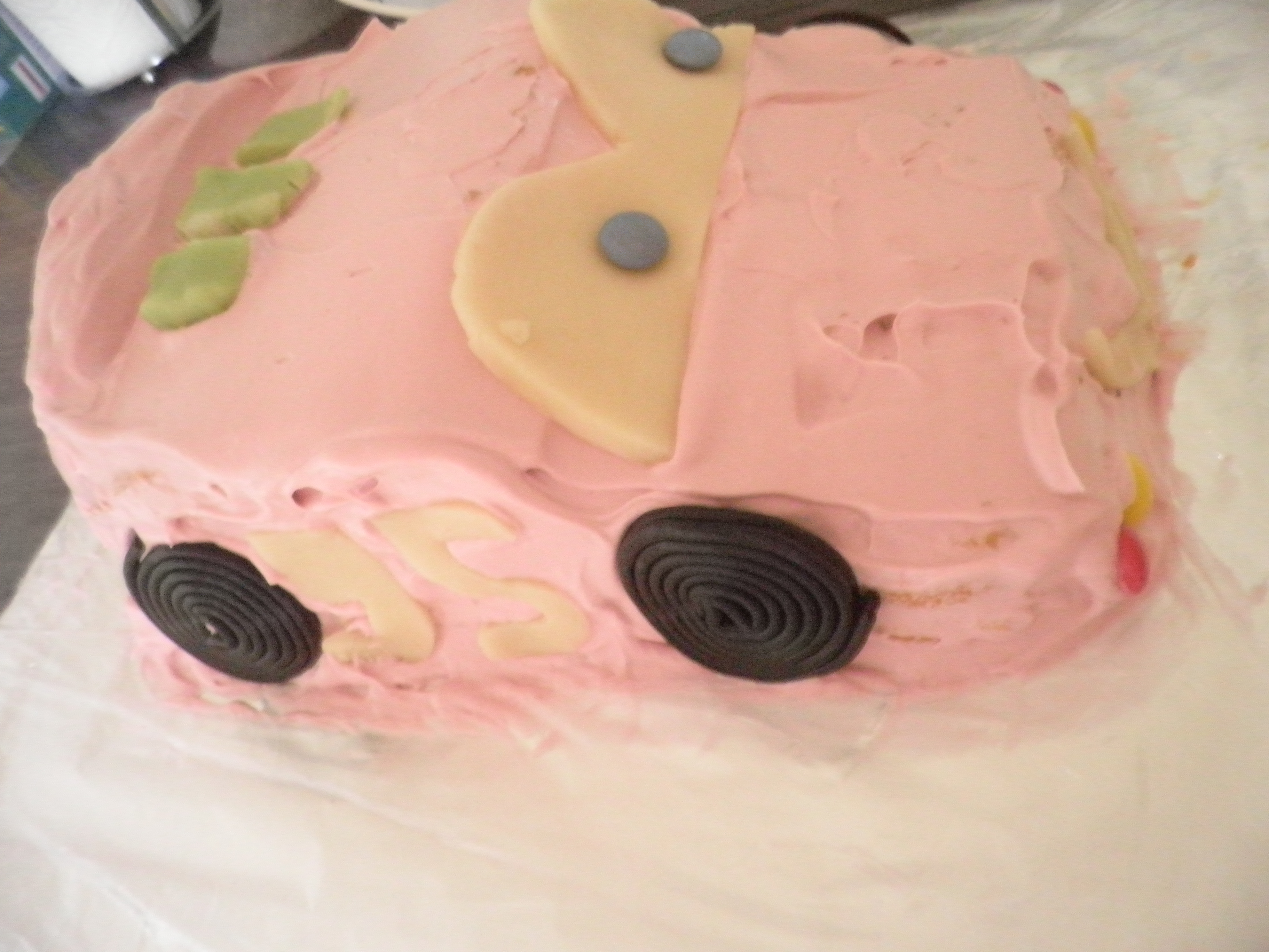 ♥ J’ai utilisé comme d’habitude ma recette de génoise, et ensuite taillé le gâteau à la forme voulue, entre les couches de gâteau, j’ai utilisé de la crème pâtissière. On l’a décoré avec un glaçage coloré en rouge rose foncé, de la pâte d’amande pour les yeux, la bouche, des bonbons colorés pour les yeux, les feux, et des rouleaux à la réglisse pour les roues !