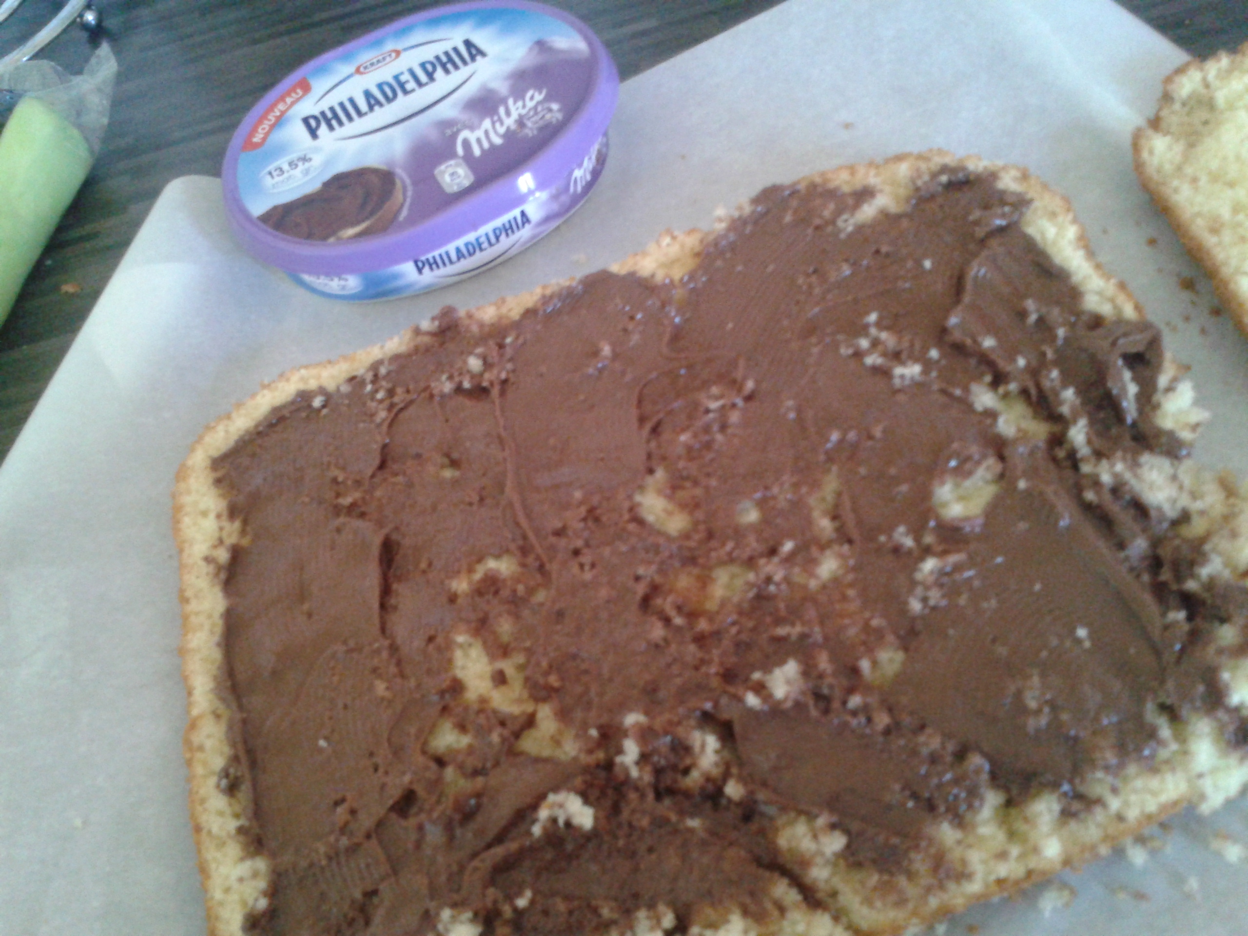 Que je vous explique : j’ai utilisé comme d’habitude ma pâte à gâteau, je l’ai coupé en deux, et tartiner du chocolat Milka (miam !)