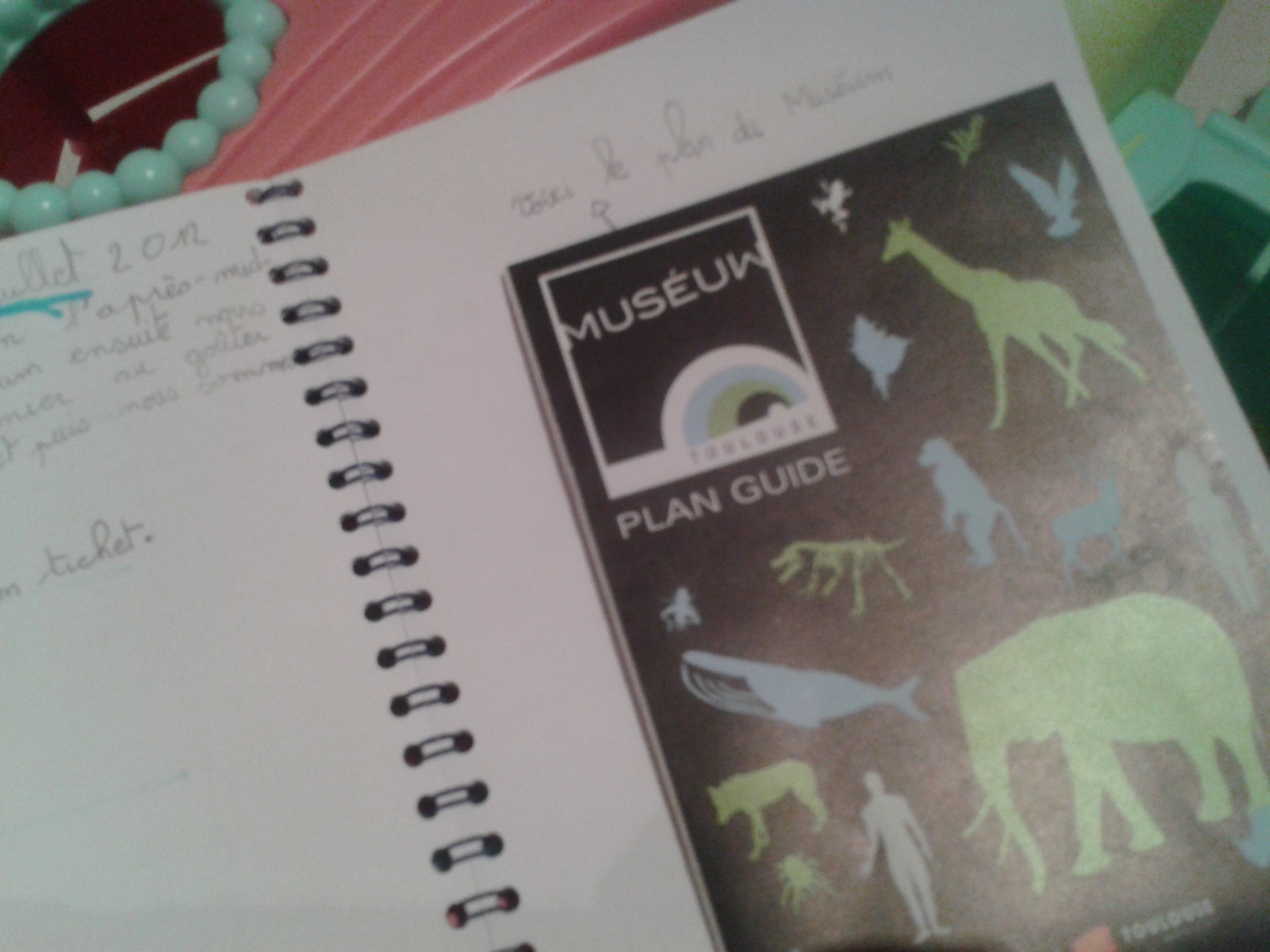 Avec ma fille, je lui ai suggéré de tenir un petit journal lors de nos vacances, et cela lui plaît beaucoup. On le fait ensemble,on corrige les fautes (eh oui ça fait travailler en même temps), je lui apprends à systématiquement à conserver les tickets d’entrée, des mini affichettes ou bien des plans, les prospectus… pour l’instant c’est encore un peu à l’état brouillon, mais je vais lui apprendre à coller tout ça, on va mettre du masking tape et ce sera super !!!