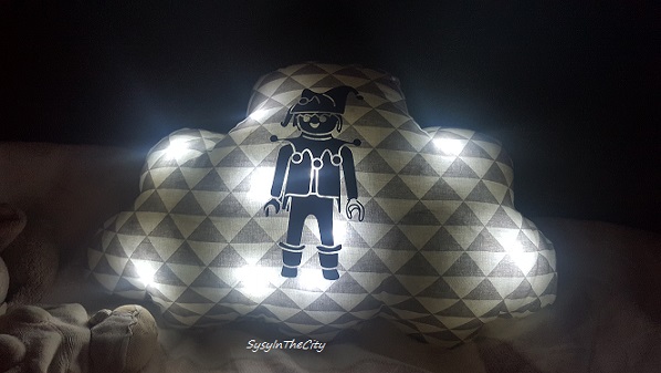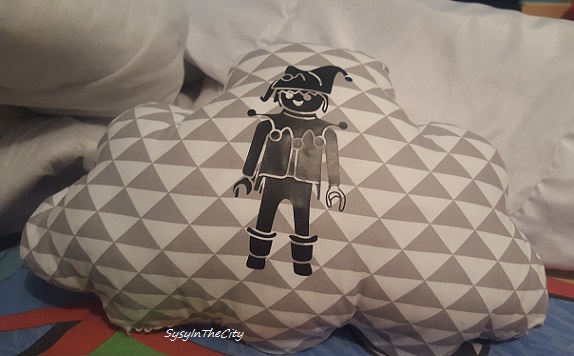 Le choix va de la jolie étoile, hibou, nuage, petite maison que j’adore ! Forcément le choix fût difficile, et j’ai choisi le coussin nuage avec le motif de Playmobil.