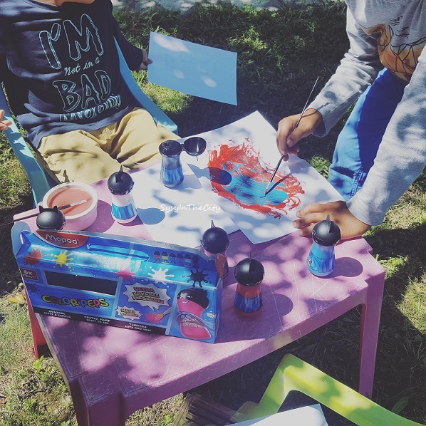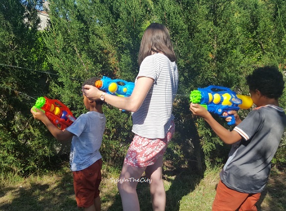 On a essayé de profiter de chaque moment, il a fait tellement beau, de la peinture au jardin. Et puis, hier j’ai eu le nez creux, je leur ai acheté chez Babou, leur pistolet à eau, ils ont passé la journée à s’arroser avec cette chaleur, c’était top !