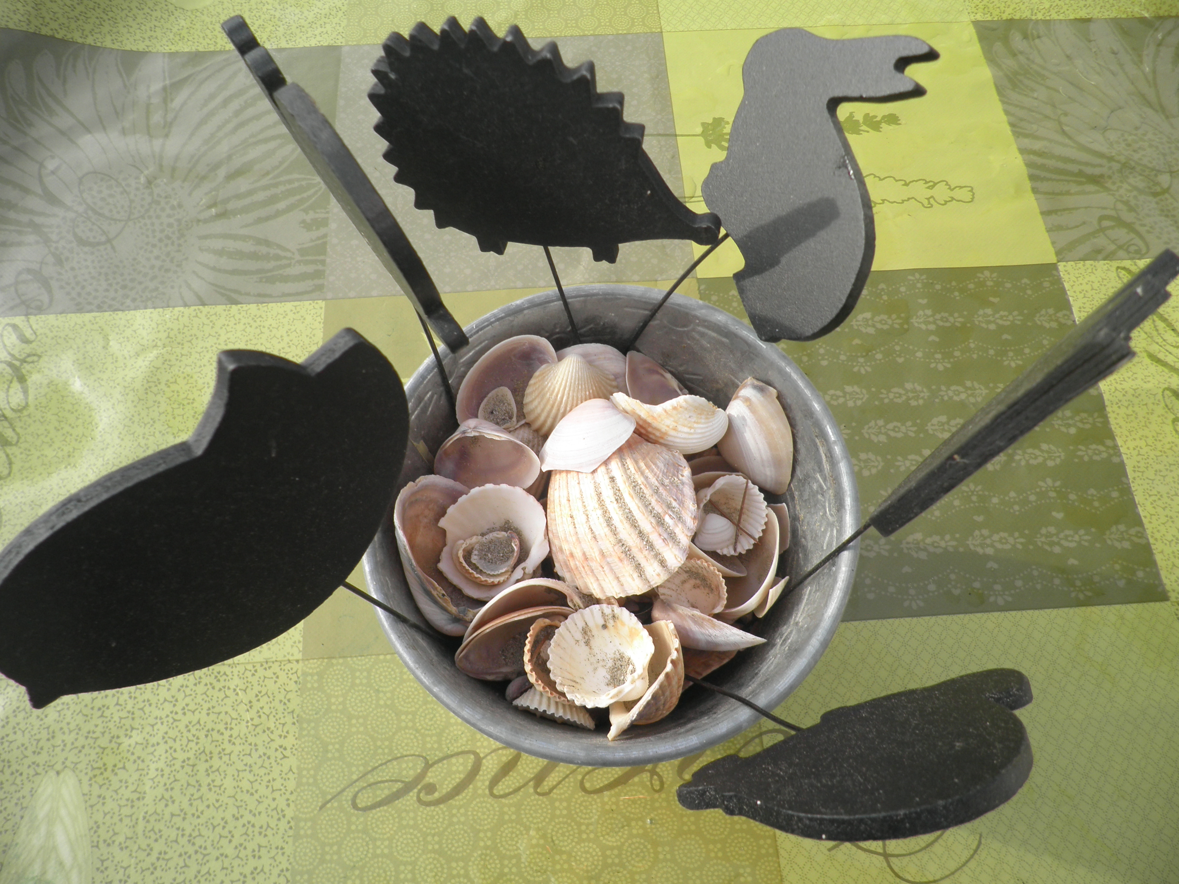 J’aime cette petite déco sur ma petite table de jardin, un joli petit seau, les coquillages et les piques pour le potager … j’en ai fait une autre utilisation !!!