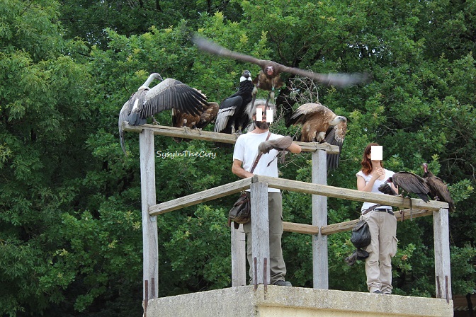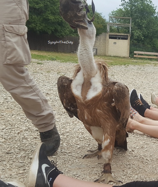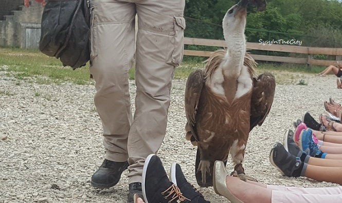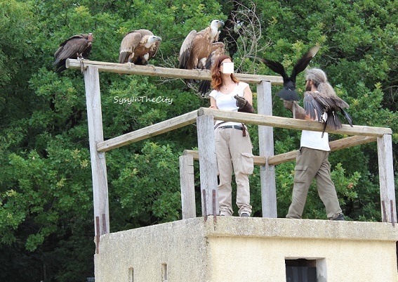 Evidemment, on ne peut pas les caresser, mais les voir de très près, ce qui rend la visite encore plus intéressante. Les enfants ont adoré, surtout le spectacle des envols. Mais surtout le passage de Casimir, le vautour. Les animateurs demandent aux spectateurs de s’asseoir à même le sol, et on se fait enjamber par ce grand vautour, quelle expérience, quel souvenir !