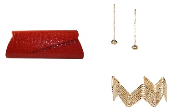 Une délicate pochette rouge croco à 14,90 euros au Paradis du Sac ; de jolies boucles d’oreilles pendantes en plaqué or à 9,50 euros et un bracelet zig zag à 13,58 euros chez Asos.
