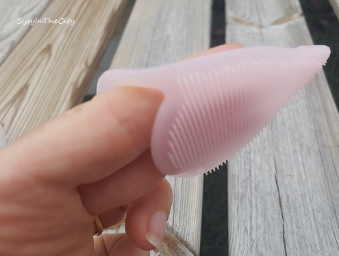 – Un pad exfoliant (3.50 €), un gadget que je ne connaissais pas du tout. De forme triangulaire, muni de picots souples en silicone, ce pad élimine en profondeur les impuretés et les excès de sébum. Le plus de ce produit, un embout spécial pour nettoyer les arêtes du nez.