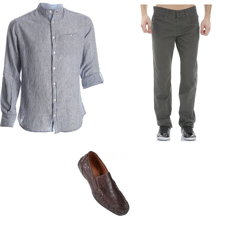 Chez Kiabi, une jolie chemise bleue effet lin qui coûte 19,99 euros et un jean gris à 14,99 euros et les mocassins de chez Tati au prix de 22,99 euros.