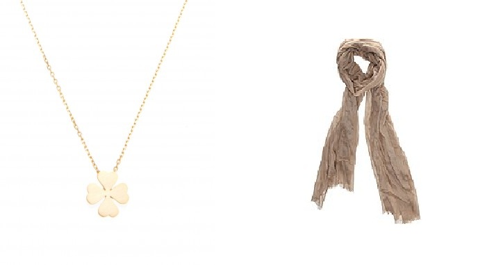 Un joli collier de chez Mia Reva (magnifique boutique) à 22 euros, un joli foulard de couleur taupe chez Kiabi au prix de 7,99 euros ; un sac à main de la Halle à 16,99 euros.