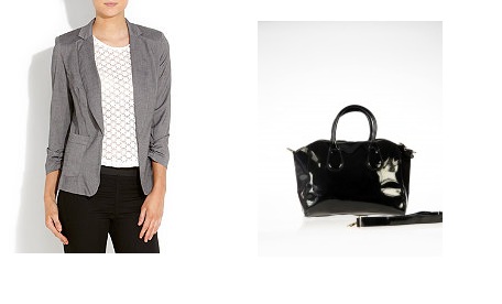 Un blazer gris de chez New Look à 29,99 euros et un sac vernis de couleur noire chez Miss Coquines au prix de 29,90 euros.