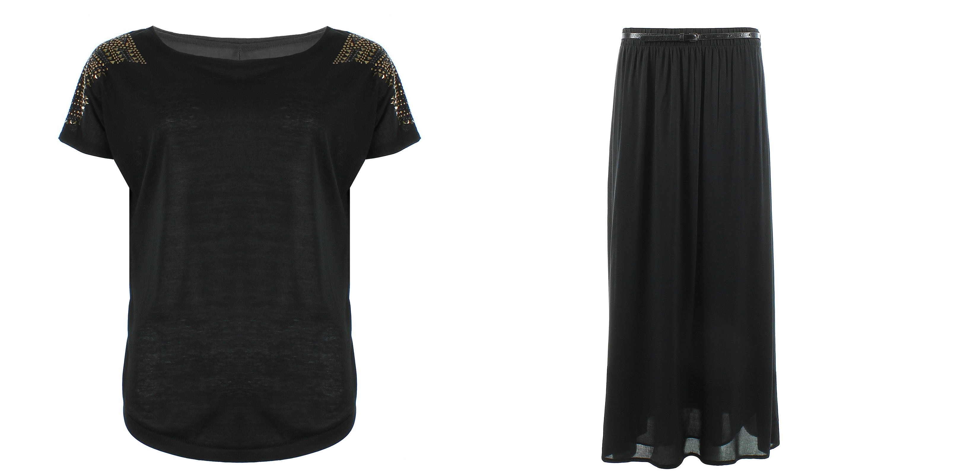 Voici une jolie jupe longue noire au prix de 24,99 euros et un tee-shirt aux épaules cloutées au prix de 16,99 euros chez Mim.