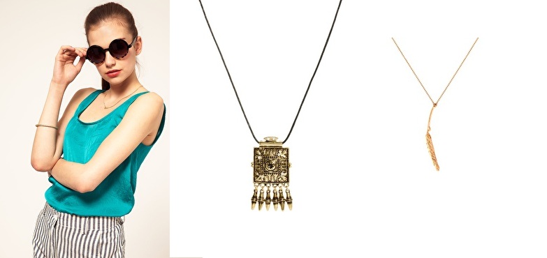 Des lunettes de soleil de forme ronde, très tendance cet été, et colliers.