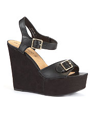 Rachel porte des sandales noires à brides et à semelles épaisses. Voici pour nous, chez New Look au prix de 29,99 euros :