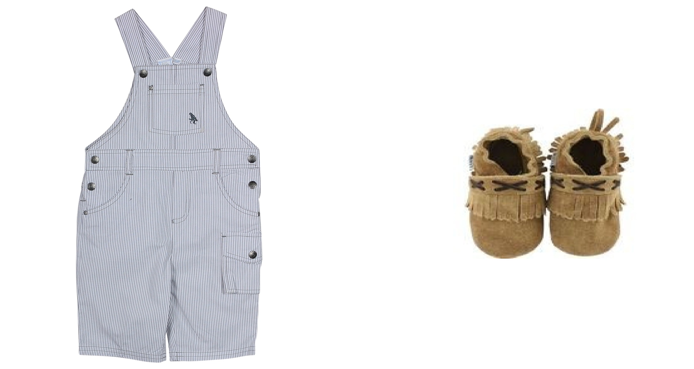 Une petite salopette des Galeries Lafayette au prix de 22,90 euros et des petits mocassins de chez Gaspard et Zoe qui coûtent 19,95 euros.