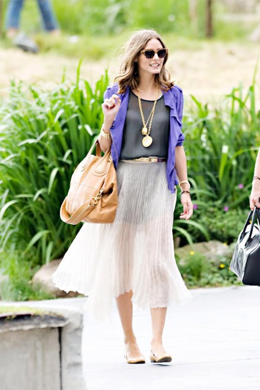 Vous manquez d’inspiration, alors faisons confiance à notre modeuse. Pour cette jolie tenue, Olivia Palermo porte un perfecto pour une note un peu rock, une maxi- jupe plissée, un top gris, une ceinture dorée pour marquer la taille, des ballerines d’une couleur neutre, et des colliers pour donner du style à son top.