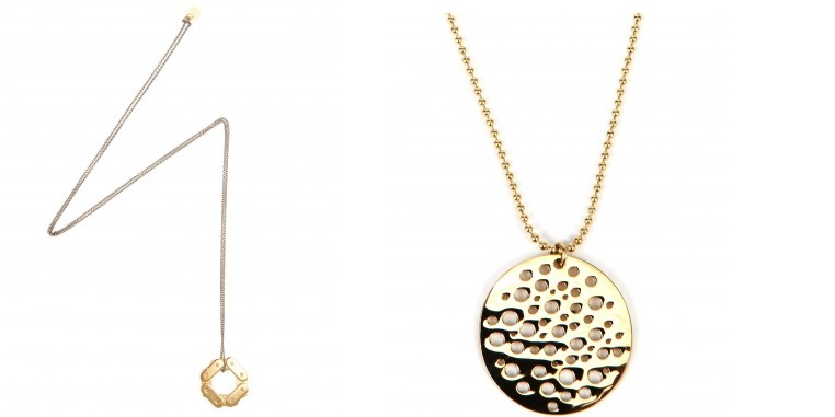 Sur le top gris, vous pouvez porter ces jolis colliers, le sautoir coûte 25 euros, le collier à 18 euros, chez MiaReva.
